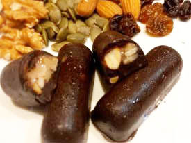 Derretir el chocolate a baño maría. En un molde hacer una camita delgada de chocolate, dejar en el refrigerador por 10 min. reservar el resto. Luego picar los frutos secos en el grosor que más guste. Sacar el molde del refrigerador, rellenar con los frutos secos y chirimoya. Tapar con una capa de chocolate y al refrigerador por unos 20 min. o hasta que estén duritos.